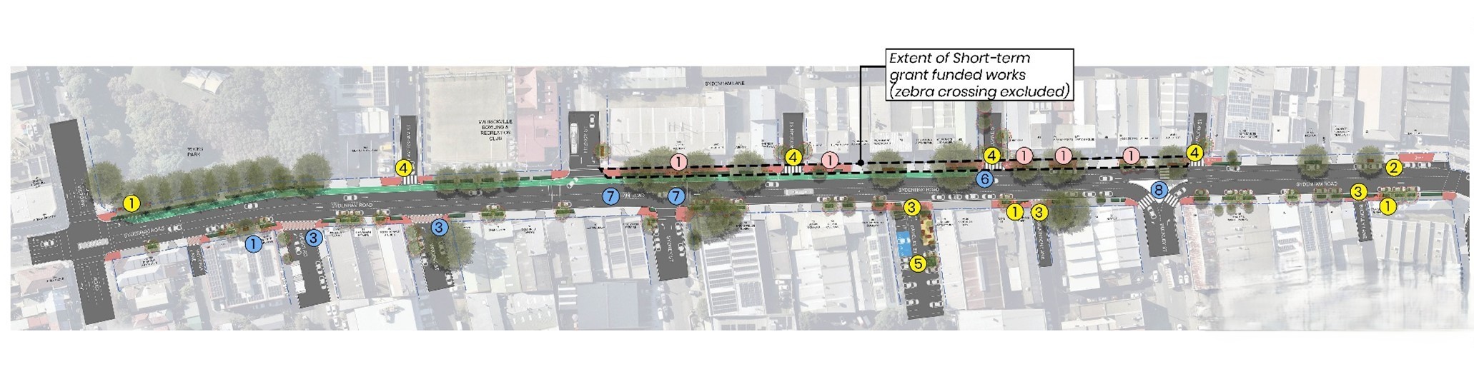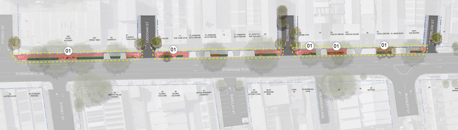 - Kerb extensions and continuous footpath treatments along the southern side of Sydenham Road