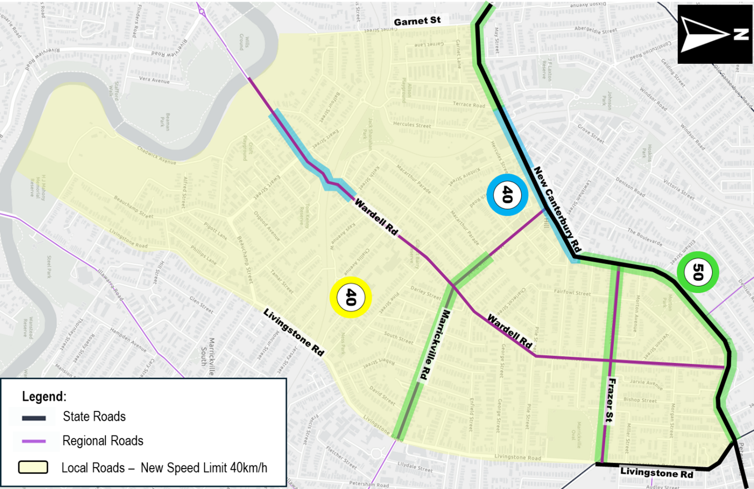 We are implementing stage two of InnerWest@40. The changes for this area include lowering speed limit to 40km/h in local streets shaded yellow on the image below.