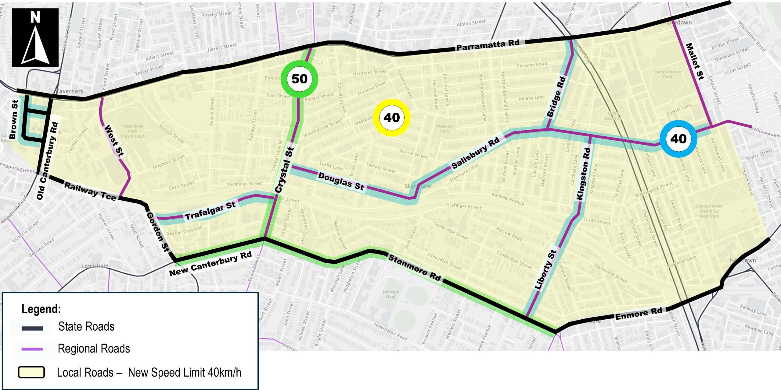 and to 50km/h on Crystal Street, New Canterbury Road and Stanmore Road.