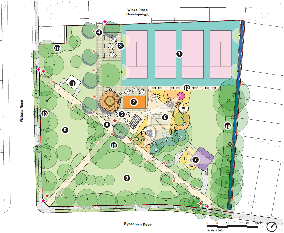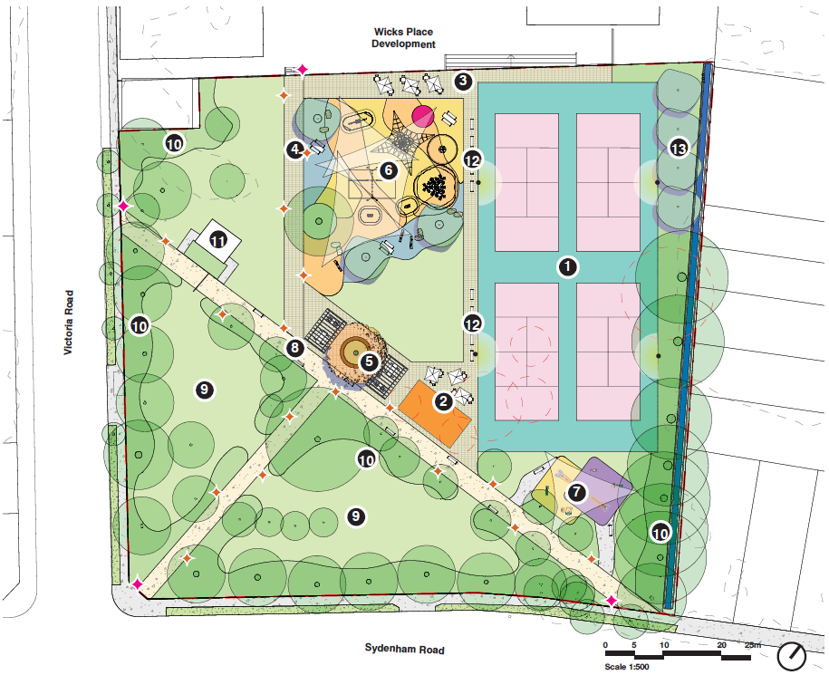 Located on the busy intersection of Sydenham Road and Victoria Road, Wicks Park features tennis courts, a playground, picnic tables and barbecues.